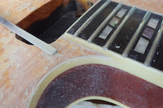 最後にボディのパテを削りながら表面に残ったシーラーっぽいのを削りましたが、ボディトップのアーチを変えないようにウエスを団子にしてドライリューブを使いました。写真ないですが裏面は平らなので1x4の端材とドライリューブです。